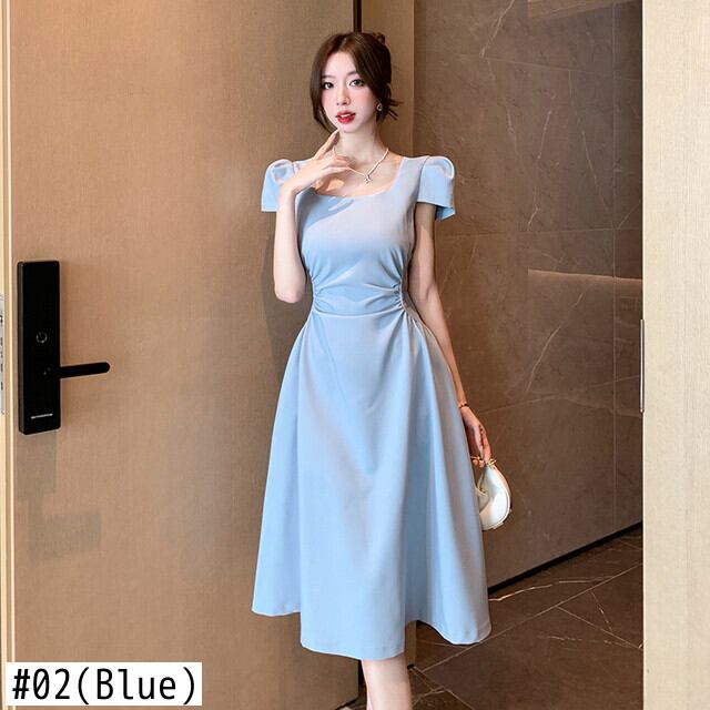 ソリッドカラースクエアネックミッドレングスパーティードレス夏オフィスレディパフスリーブチュニックスリムドレス サマー 夏物 スクウェア 会社 学校 通勤や通学にも