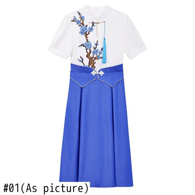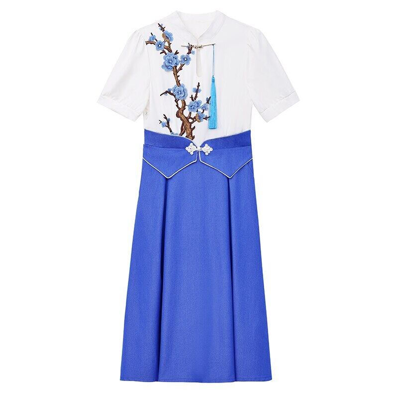 中国風偽ツーピース韓服ドレススタンドカラー半袖レディ刺繍パーティードレス ショート ハーフスリーブ