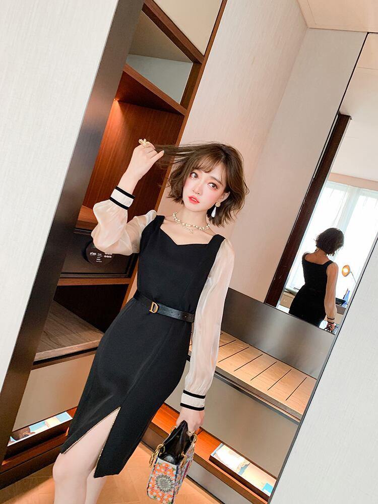 シック光沢あるシースルーガーゼ袖ブラックスリムパーティードレスベルト付きスクエアネックステッチドレス ハーネス スクウェア