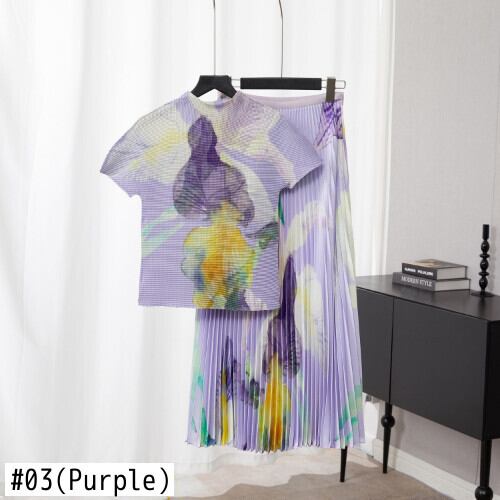 三宅プリーツニッチ 2 ピースセット: 抽象プリントスリム T シャツ + ウエストプリーツスカート 2 点セット衣装 Tシャツ