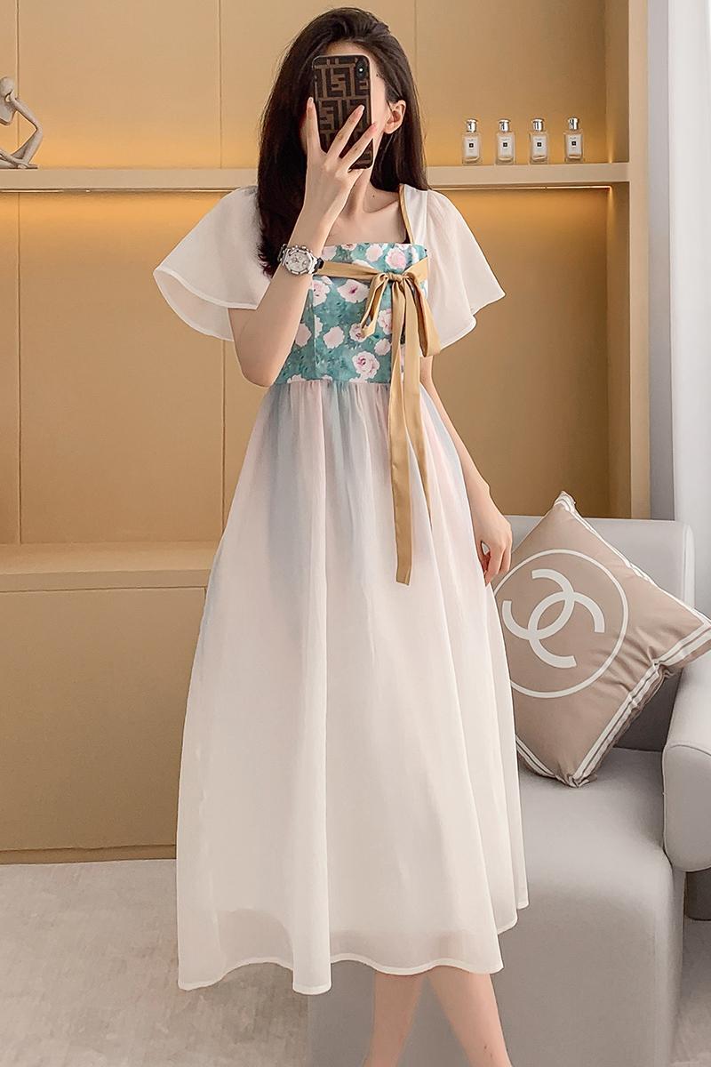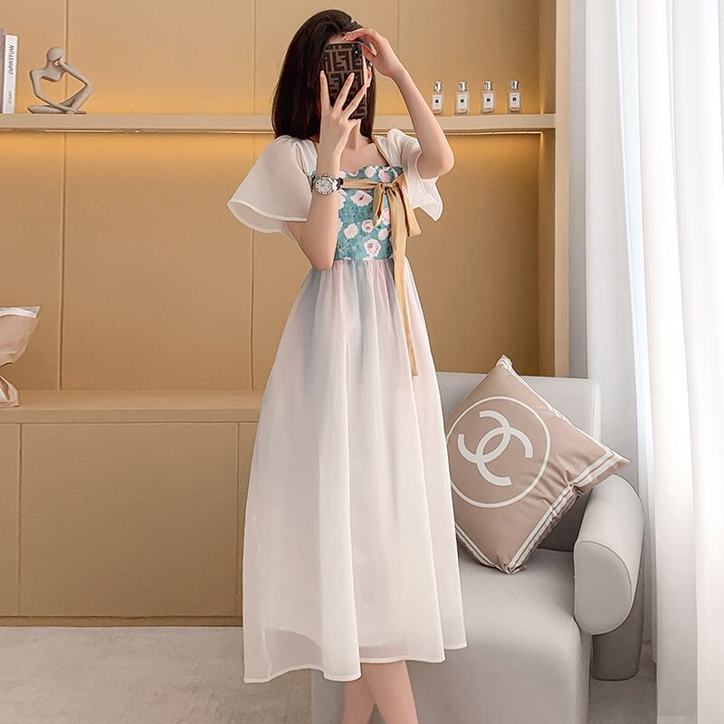 花柄パッチワークホワイトドレスシックフリル袖スクエアカラースリムAラインドレス プリント スクウェア