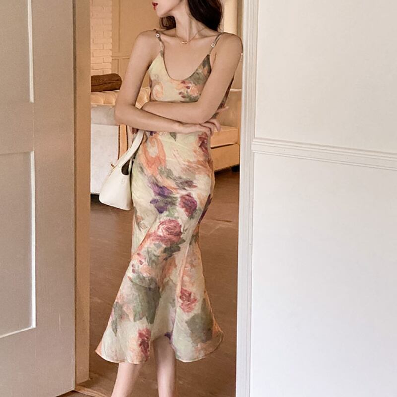 オフィス花柄パーティースリムミディドレス夏セクシー背中開いたスリムスリングドレス プリント サマー 夏物 会社 学校 通勤や通学にも
