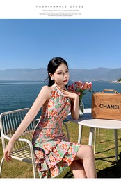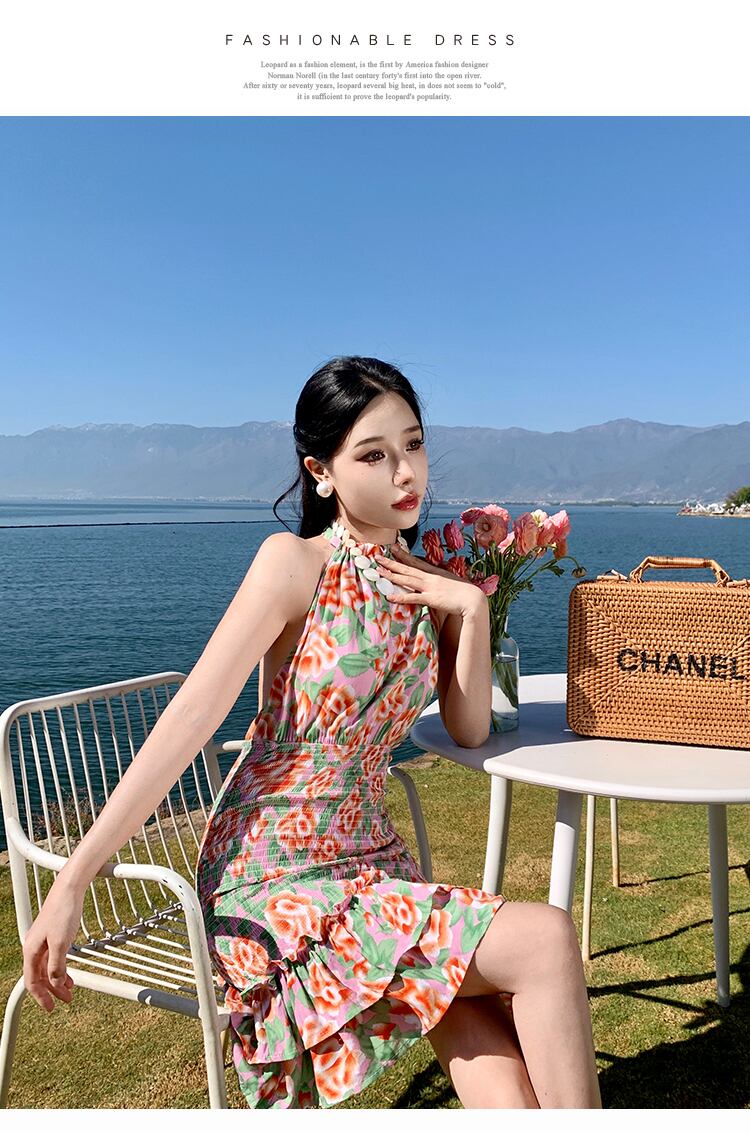 シックで背中開いたホルターネックパーティーミニドレス花柄プリント弾性ウエストセクシーボディコンドレス エラスティック 伸縮