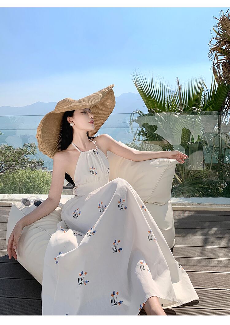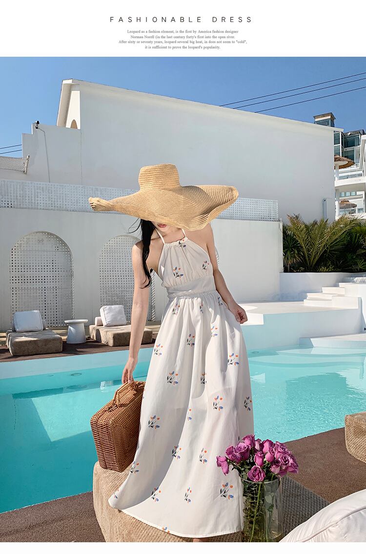 ホワイト花柄プリントホルターネックロングパーティードレス夏セクシー背中開いたレースアップマキシドレス サマー 夏物