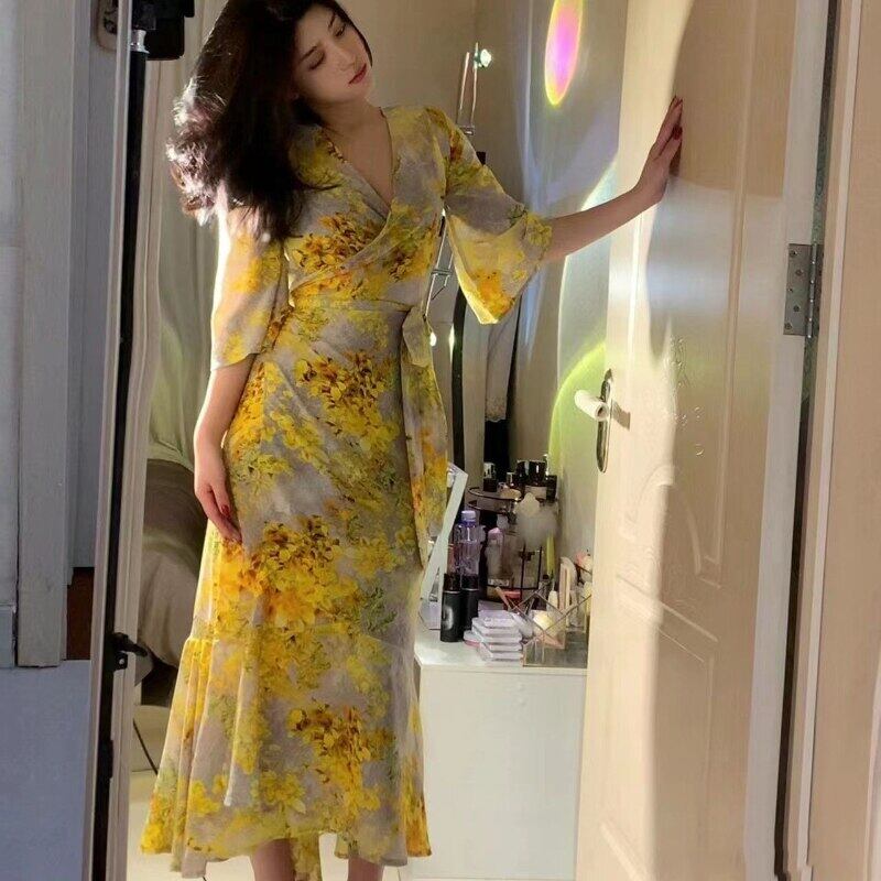 フレンチワンピースラップレースアップロングパーティードレス夏セクシー V ネックスリットビーチホリデードレス サマー 夏物 Vネック
