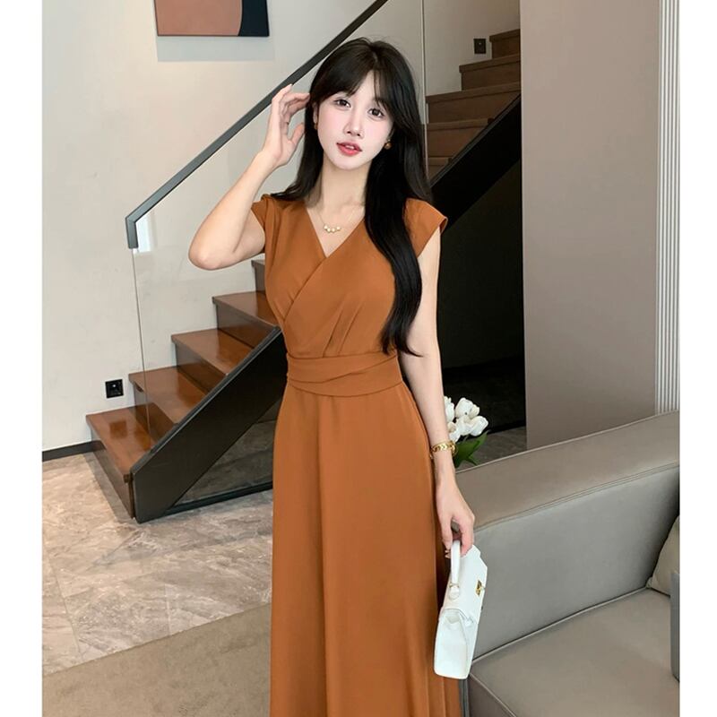 夏無地スリムパーティードレス V ネックノースリーブスリムミッドレングスドレス服 サマー 夏物 Vネック ソリッドカラー