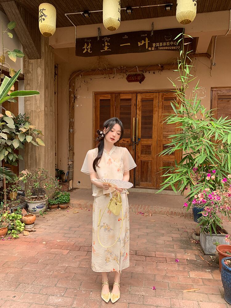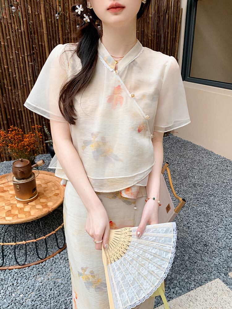 中国風改良漢服花柄プリント2点セット服:レトロスタンドカラートップ+ウエストスリットスカートセット
