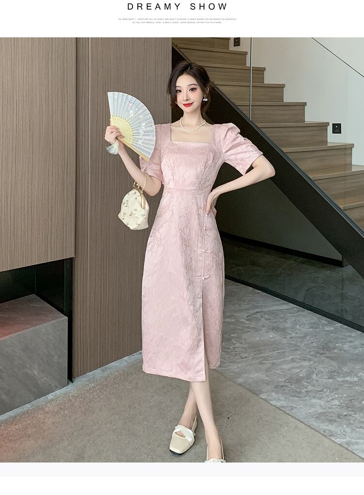 スクエアカラーピンクジャカードパーティーウエディングドレス中国風バックル半袖スリムチュニックドレス ショート ハーフスリーブ スクウェア