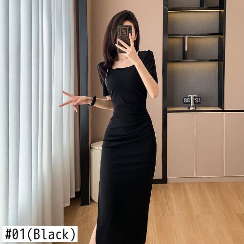 フレンチパールスクエアネックプリーツスリットドレス夏セクシースリムボディコンスリットパーティーウエディングドレス サマー 夏物 真珠 スクウェア