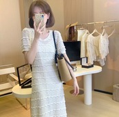 Clic ベージュと黒レース中空ミディドレスラウンドカラー半袖スリムドレス ショート ブラック ハーフスリーブ