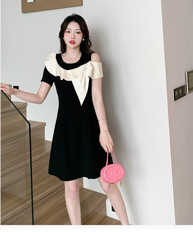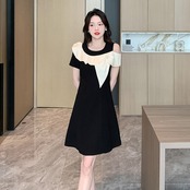 ブラックパッチワークフリルミニドレスラウンドカラーオフショルダー半袖スリムパーティードレス ショート ハーフスリーブ