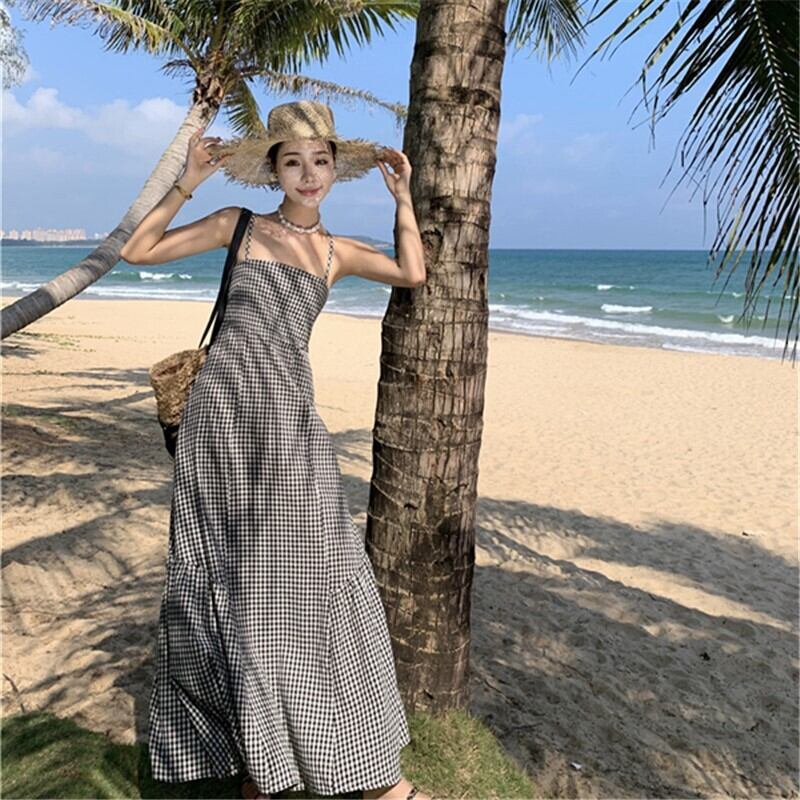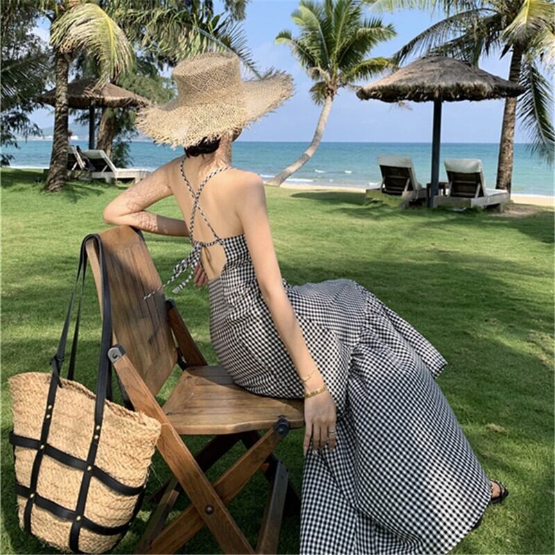 Clic 黒と白チェック柄ロングサスペンダードレス夏背中開いたスリムビーチホリデーマキシドレス ホワイト ブラック サマー 夏物