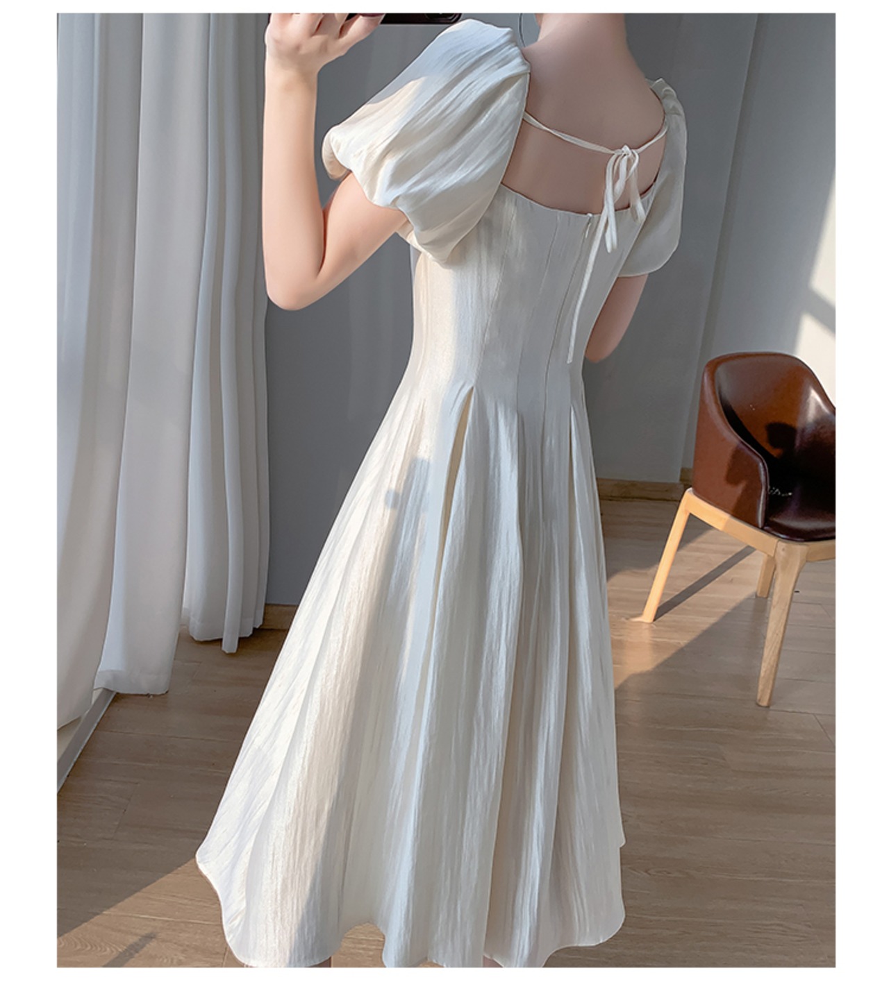 シックとパフスリーブベージュスリムパーティードレス夏オフィスレディスクエアカラーチュニックイブニングドレス サマー 夏物 スクウェア 会社 学校 通勤や通学にも