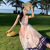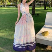 花柄プリントホルターネックロングビーチバケーションドレス夏セクシー背中開いたスリムパーティーマキシドレス サマー 夏物