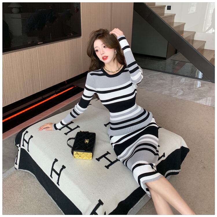 Clic ブラック/ホワイト/グレーストライプニットミディセータードレス秋長袖ベーシックボトドレス ロング オータム 秋物