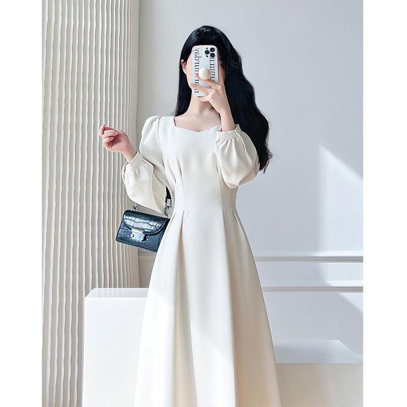 フレンチランタン袖プリーツチュニックミディパーティードレス春秋スクエアカラースリムイブニングドレス ランタンスリーブ スプリング 春物 オータム 秋物 スクウェア