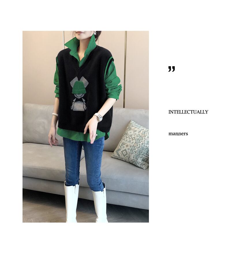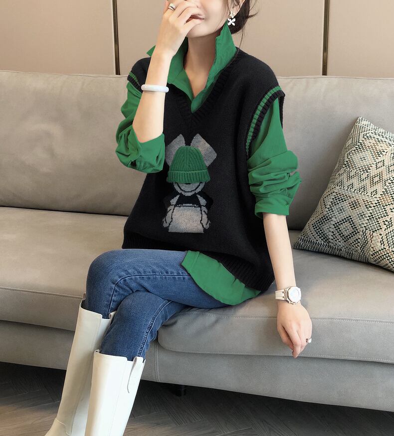 Kinnted セーター 2 点スーツ: キャラクターパターン黒ニットセーターベスト + ラペル襟グリーンブラウス 2 点セット衣装 ブラック