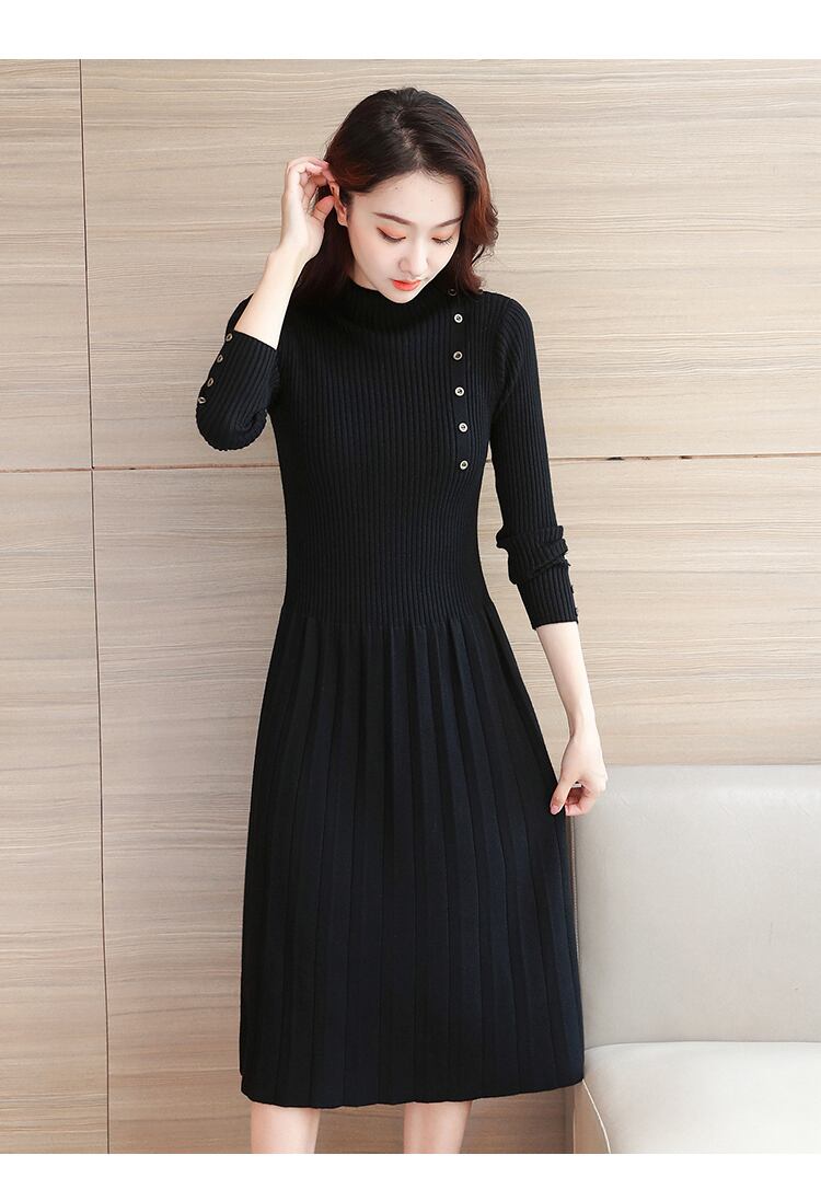 紫または黒ハーフタートルネックニット基本セータードレス秋冬スリムボタンミディドレス ブラック オータム 秋物 ウィンター 冬物 パープル