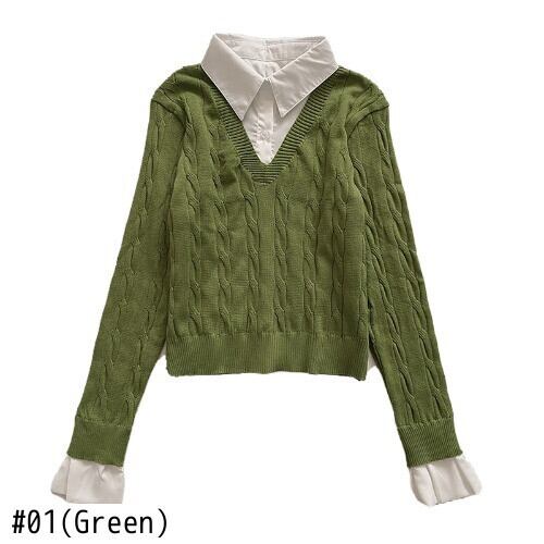 Clic ポロ襟ステッチフェイクツーピースニットセーター秋と冬長袖スリムトップ ロング オータム 秋物 ウィンター 冬物