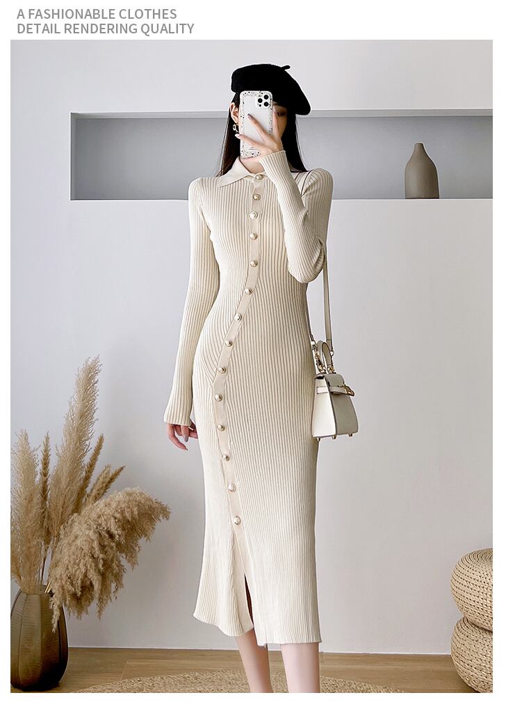 シックシングルブレストスリムニットセータードレス秋気質ボディコンボトリングドレス オータム 秋物