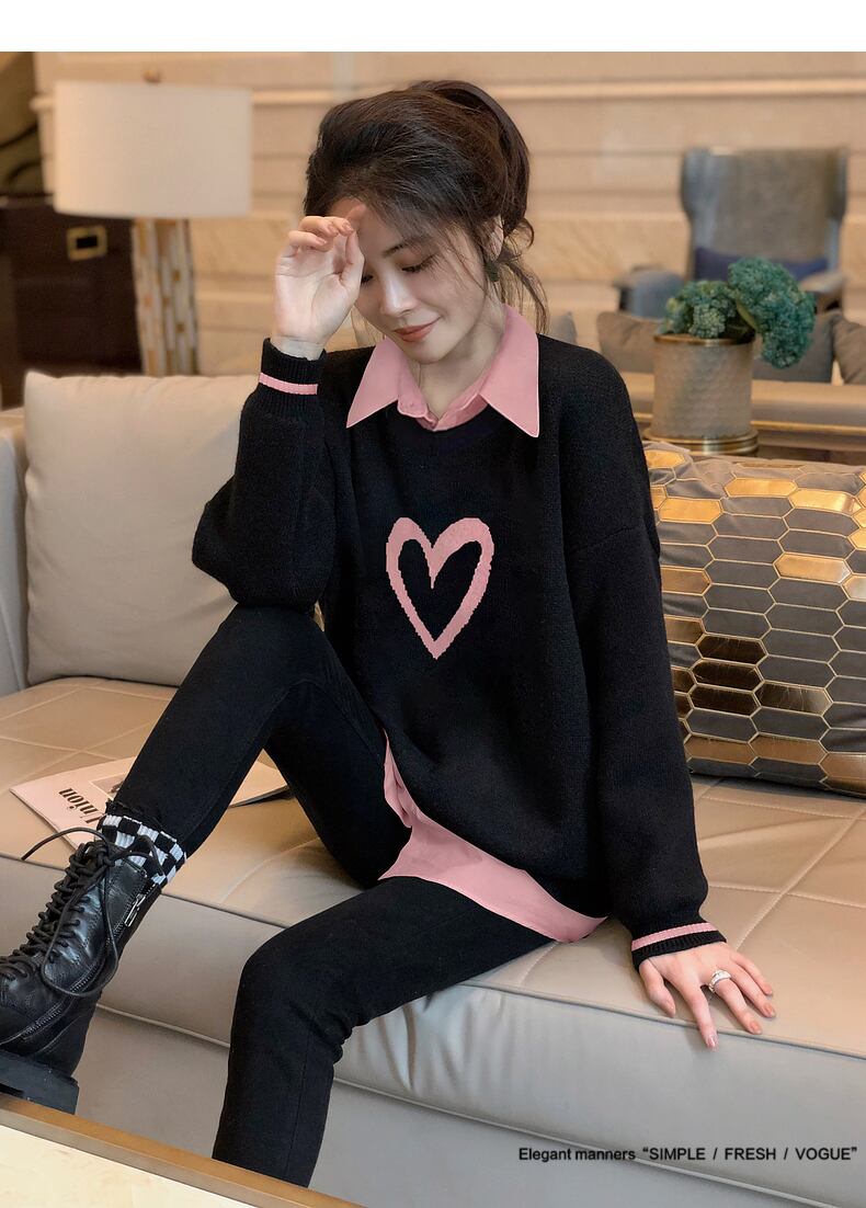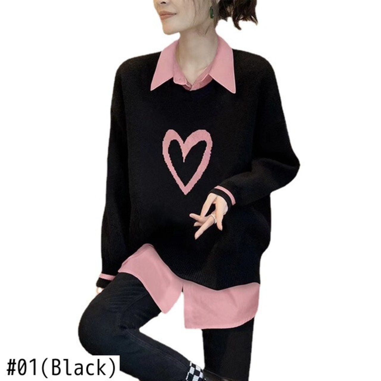 偽ツーピースニット愛ステッチプルオーバーセーター春と秋長袖ラペルルーズシャツ ロング スプリング 春物 オータム 秋物