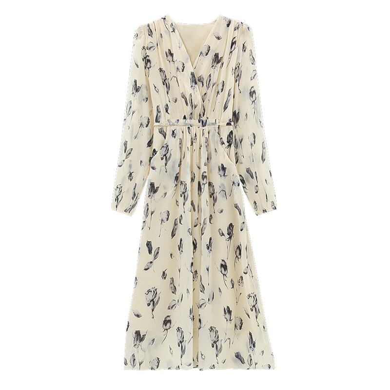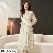 V ネック花柄パーティードレス春秋オフィス長袖スリムチュニックミディカジュアルドレス ロング プリント スプリング 春物 オータム 秋物 Vネック 会社 学校 通勤や通学にも