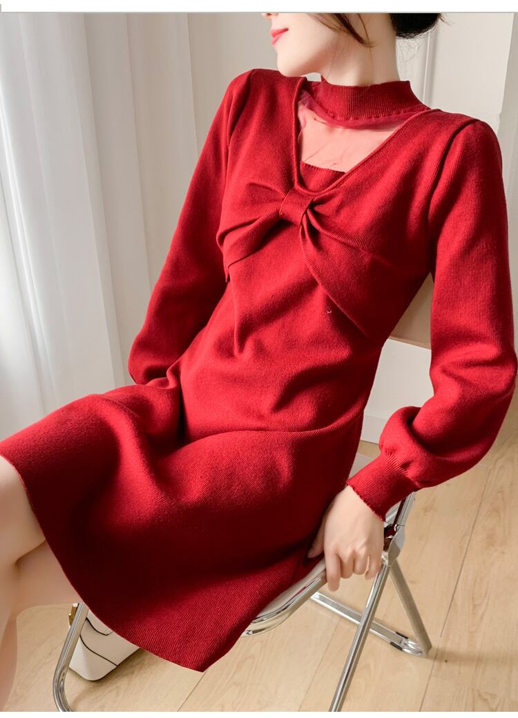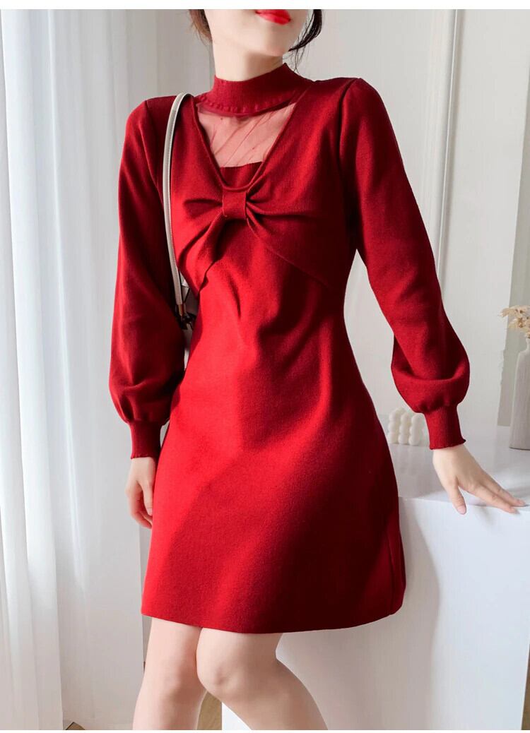 シックパフスリーブニットセータードレス春秋タートルネックレースステッチスリムチュニックミニドレス スプリング 春物 オータム 秋物