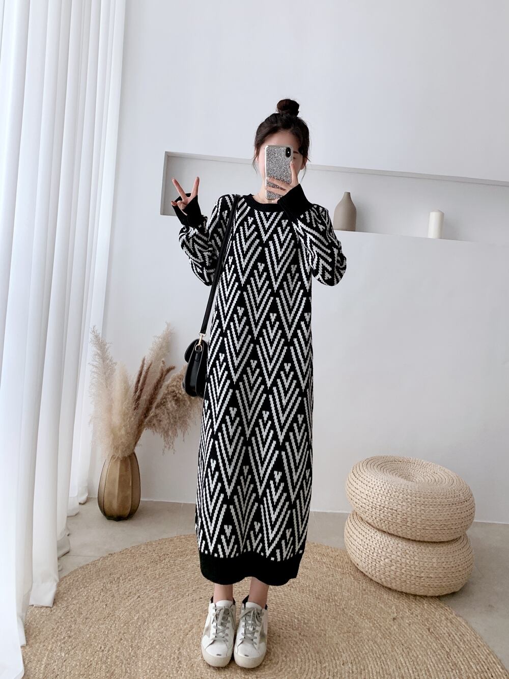 幾何学プリント厚くて暖かいニットセータードレス秋 & 冬タートルネック長袖ストレートルーズドレス ロング オータム 秋物 ウィンター 冬物