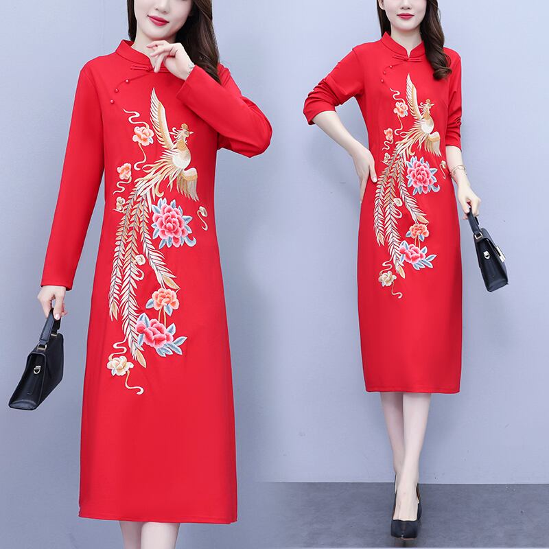 中国風改良されたチャイナドレス絶妙刺繍パーティードレス秋長袖スタンドカラー CNY レッドドレス ロング オータム 秋物