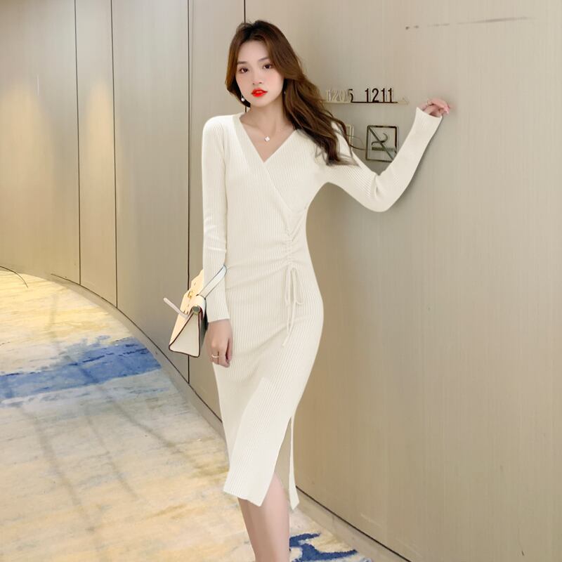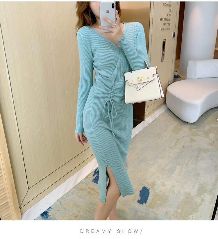 シック巾着ベーシックニットセータードレス春秋スリムチュニックボトリングドレス スプリング 春物 オータム 秋物