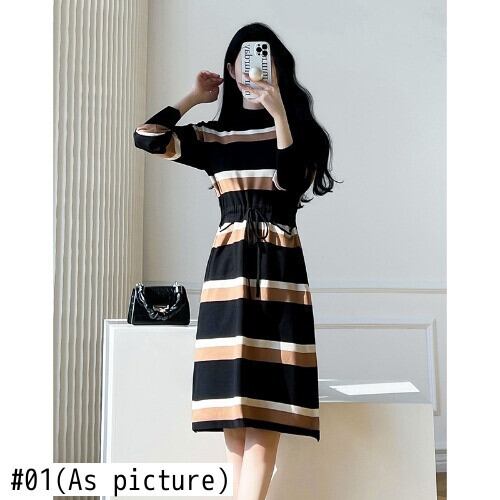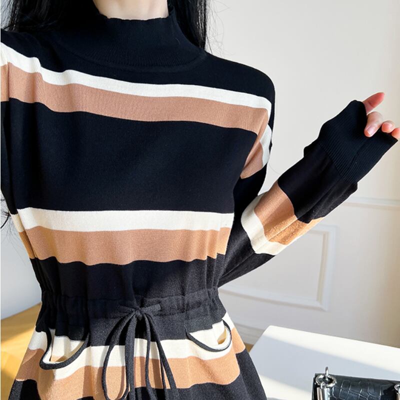 Clic ストライプ基本タートルネックニット底セータードレス春秋スリム因果巾着ドレス スプリング 春物 オータム 秋物