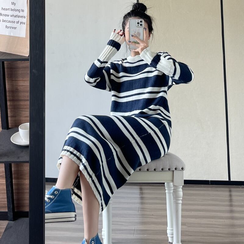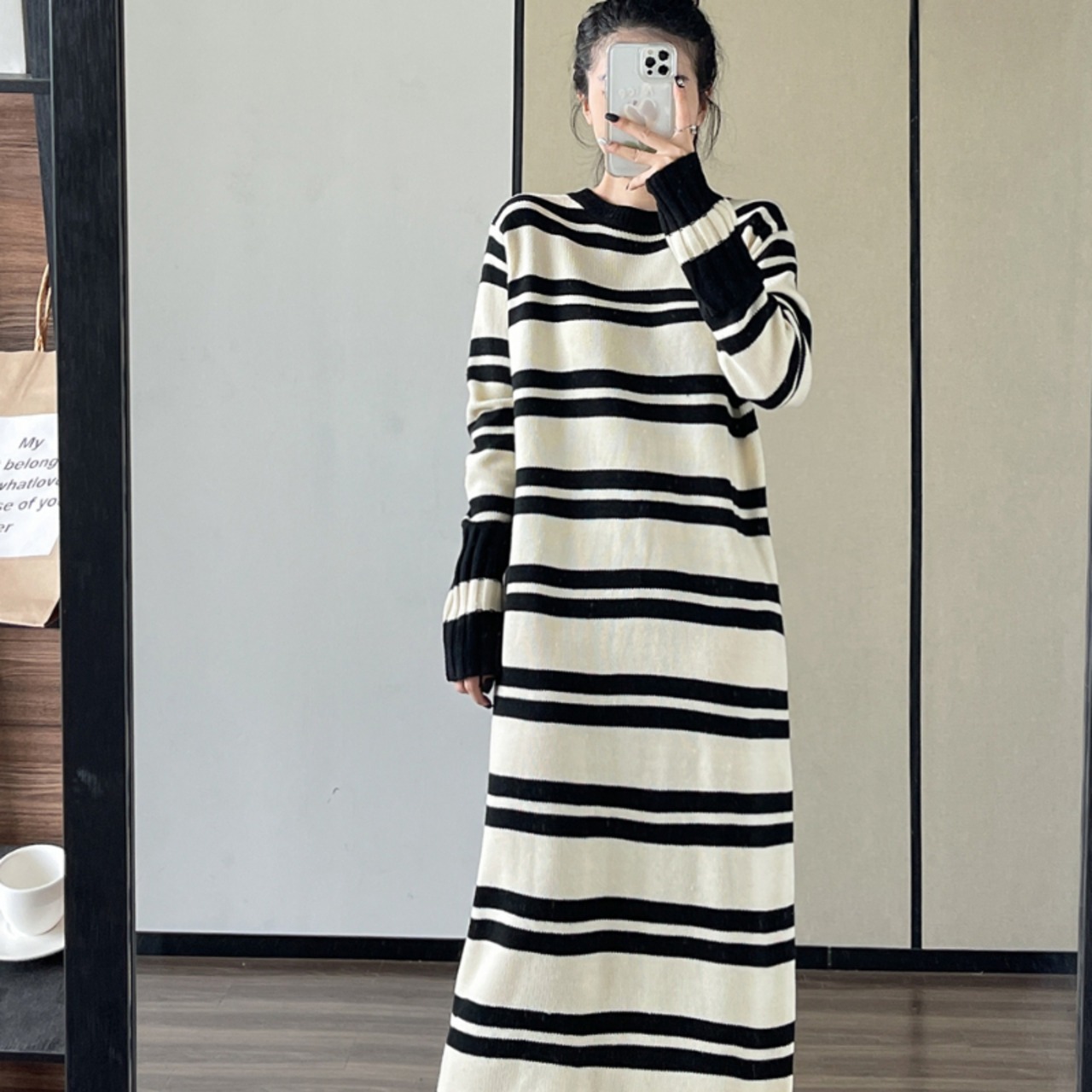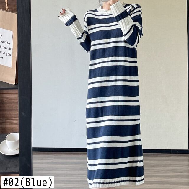 Clic ストライプニットセーターマキシドレス秋と冬長袖ベーシックミッドレングスドレス ロング オータム 秋物 ウィンター 冬物