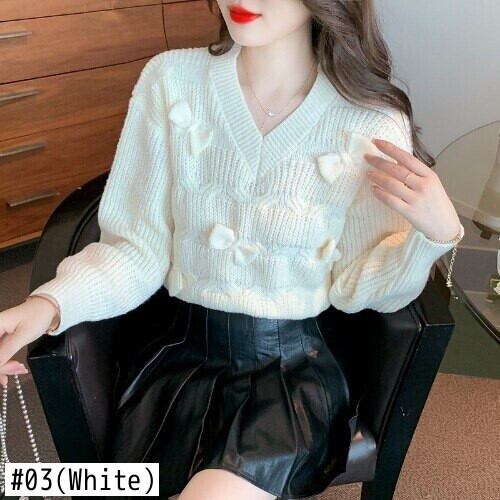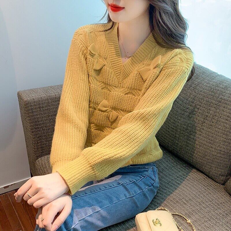 Y2K シックちょう結びプルオーバーニットセーター春秋長袖 V ネックルーズトップ ロング リボン スプリング 春物 オータム 秋物 Vネック
