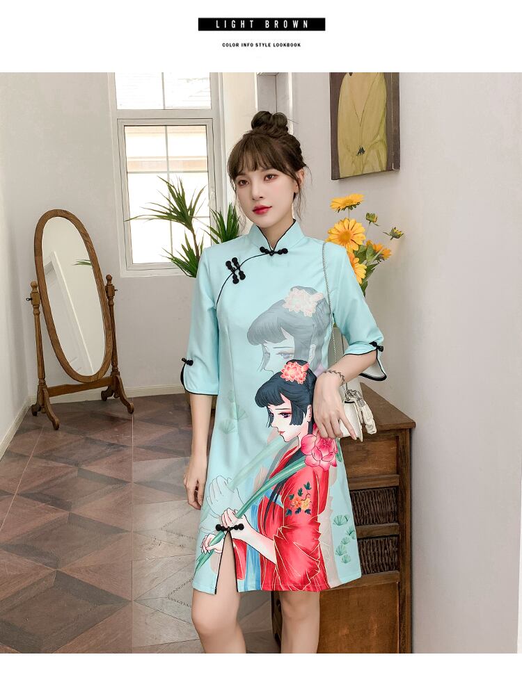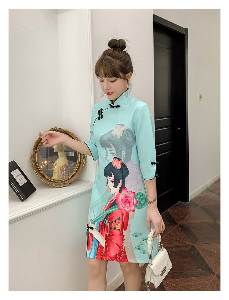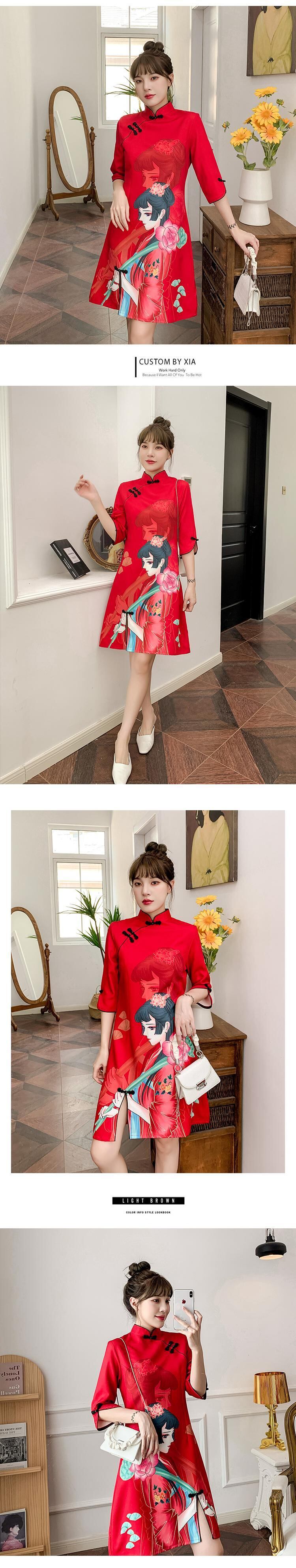 中国風改良されたチャイナドレス漫画プリントパーティードレスレトロスタンドカラーバックル年赤ミニドレス レッド