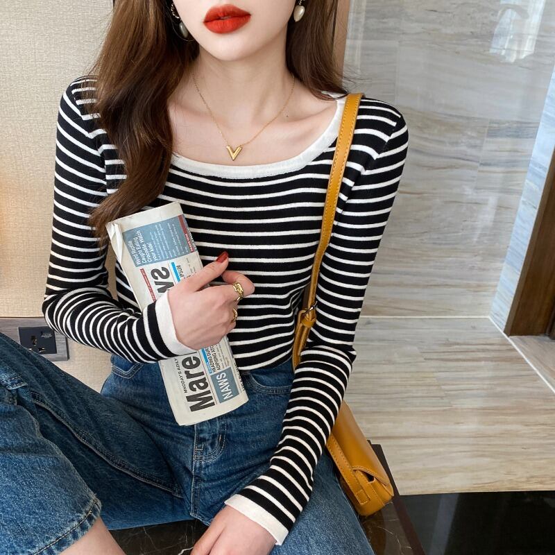 Clic ストライプ薄手ニットボトリングシャツ春と秋長袖ラウンドネックスリム Tシャツ ロング スプリング 春物 オータム 秋物 Oネック
