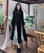 中国水墨画シフォンスプライシングスリムチュニックドレスレトロスタンドカラー長袖黒パーティードレス ロング ブラック