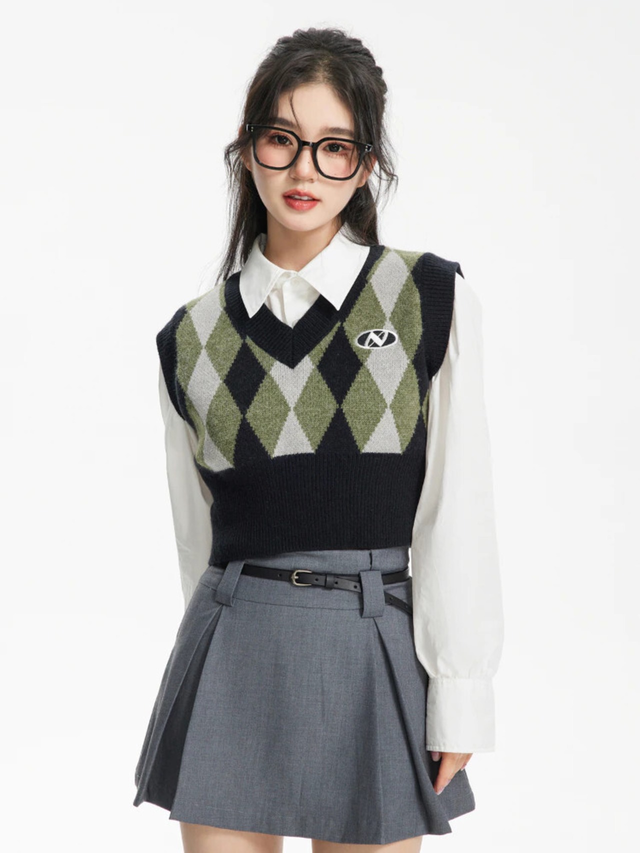 Y2k ツーピースセット衣装: V ネック刺繍チェック柄ショートニットベスト + ホワイトラペル長袖シャツ 2 ピースレディースセット ロング レッド Vネック