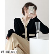 ベージュ&ブラックパッチワークニットカーディガン春秋Vネック長袖スリムストリートセーター ロング スプリング 春物 オータム 秋物