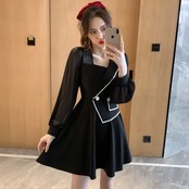 秋オフィスブラックシック通勤ミニドレス長袖シングルカラースリムドレス ロング オータム 秋物 会社 学校 通勤や通学にも