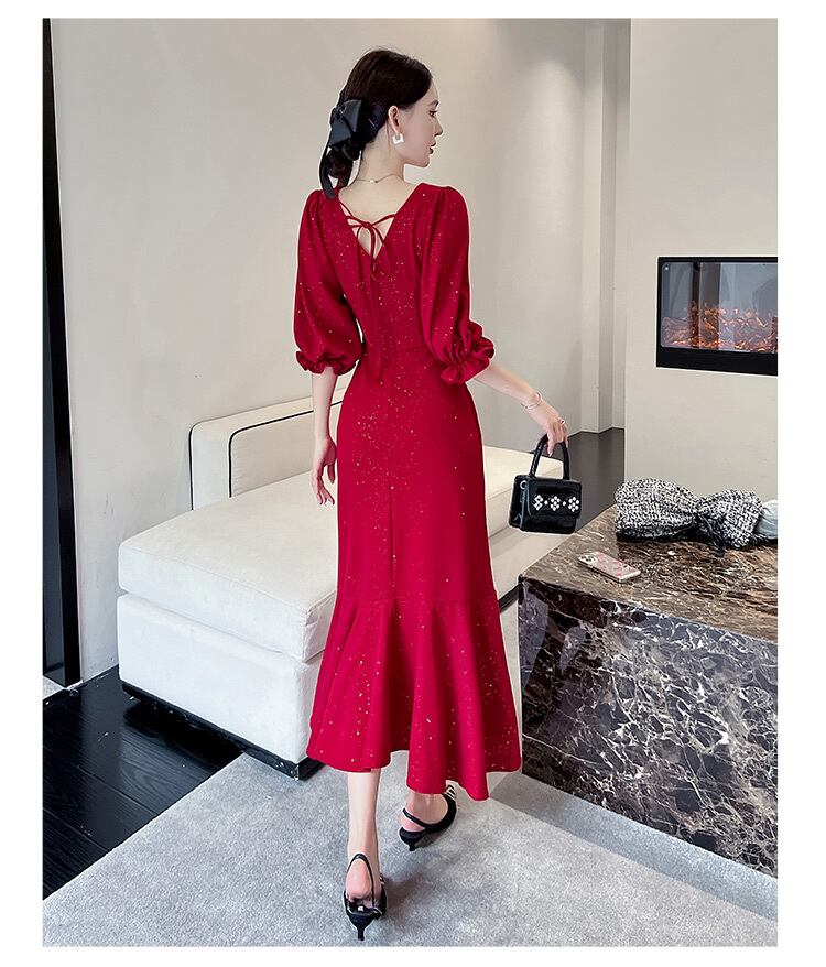 とシックフィッシュテール不規則ワインレッドパーティードレス V ネックパフスリーブスリムチュニックセクシーミディイブニングドレス Vネック