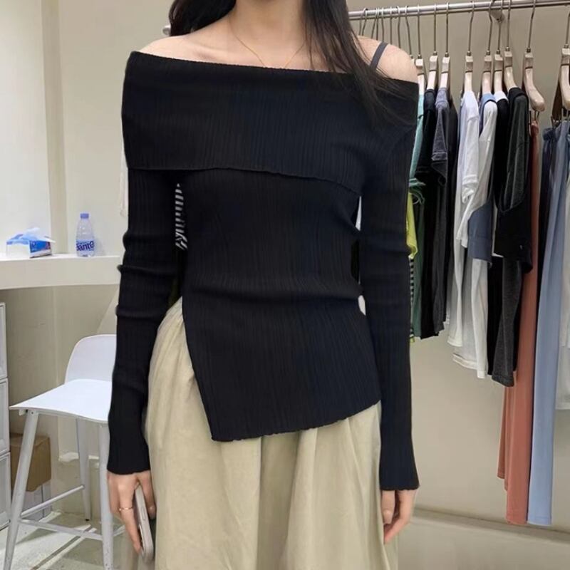ワンショルダープルオーバーニット不規則 Tシャツ春秋無地長袖スリットスリムトップ ロング スプリング 春物 オータム 秋物 ソリッドカラー