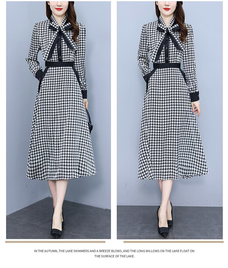 Clic 千鳥格子プリント 3 ボタンミディドレス春秋長袖スリムストリートドレス ロング スプリング 春物 オータム 秋物