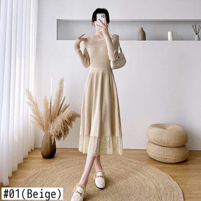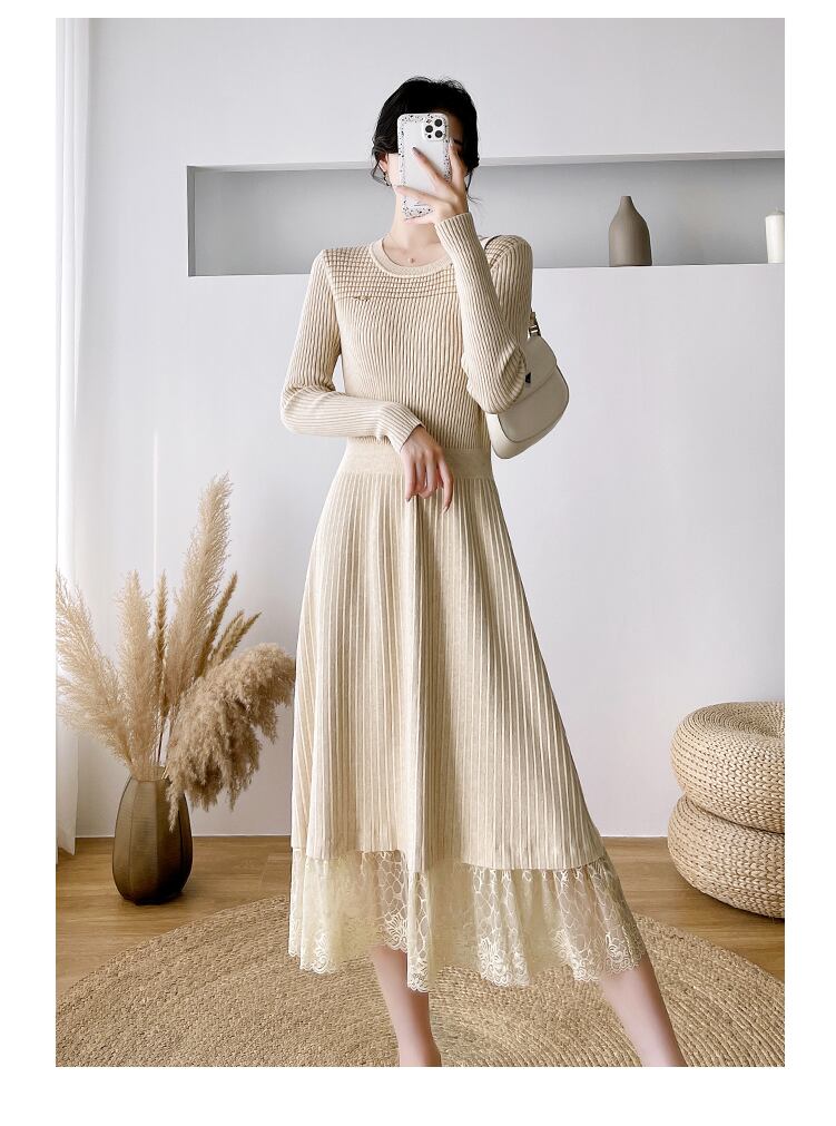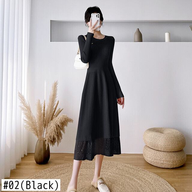 メッシュスプライシングストライプニットミディドレス秋ソリッドカラー長袖スリムチュイニック底セータードレス ロング オータム 秋物