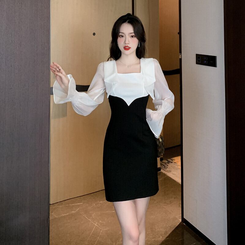 ブラック/ホワイトパッチワークフリルmalドレス秋オフィススクエアカラースリムチュニックパーティードレス オータム 秋物 スクウェア 会社 学校 通勤や通学にも