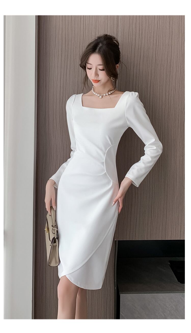 フレンチホワイトプリーツミディパーティードレス春秋スクエアネック長袖スリムチュニックボディコンドレス ロング スプリング 春物 オータム 秋物 スクウェア