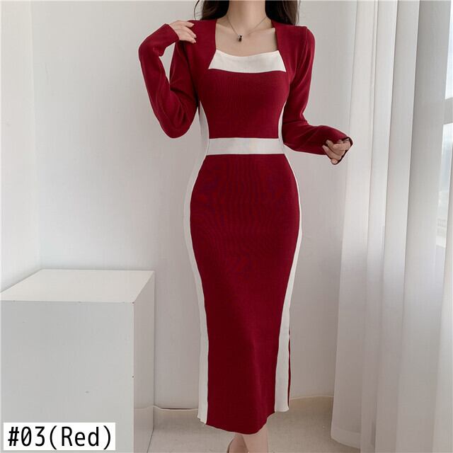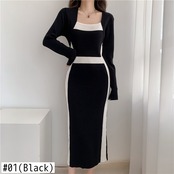 ブラック&ホワイトステッチニットセータードレス春秋スタイルスリムセクシーボディコンドレス スプリング 春物 オータム 秋物