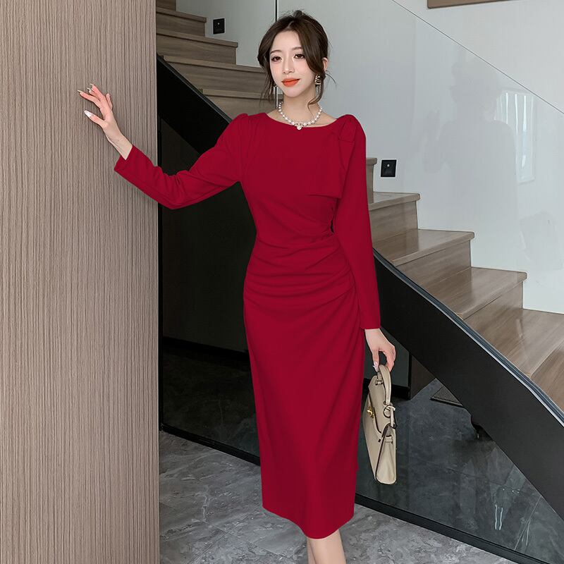 シックワンショルダープリーツパーティードレス秋オフィススリムミディボディコンドレス服 オータム 秋物 会社 学校 通勤や通学にも