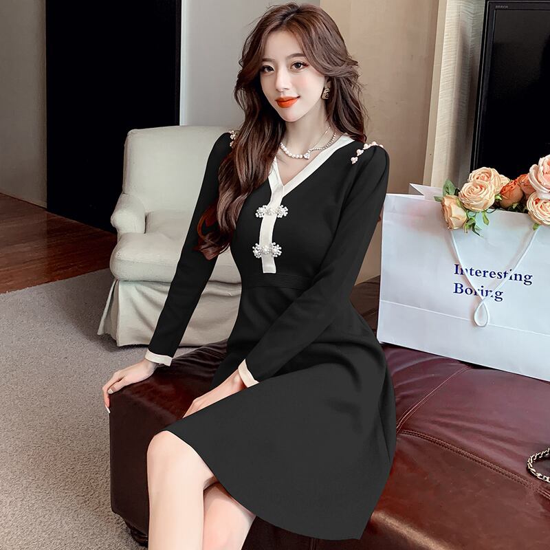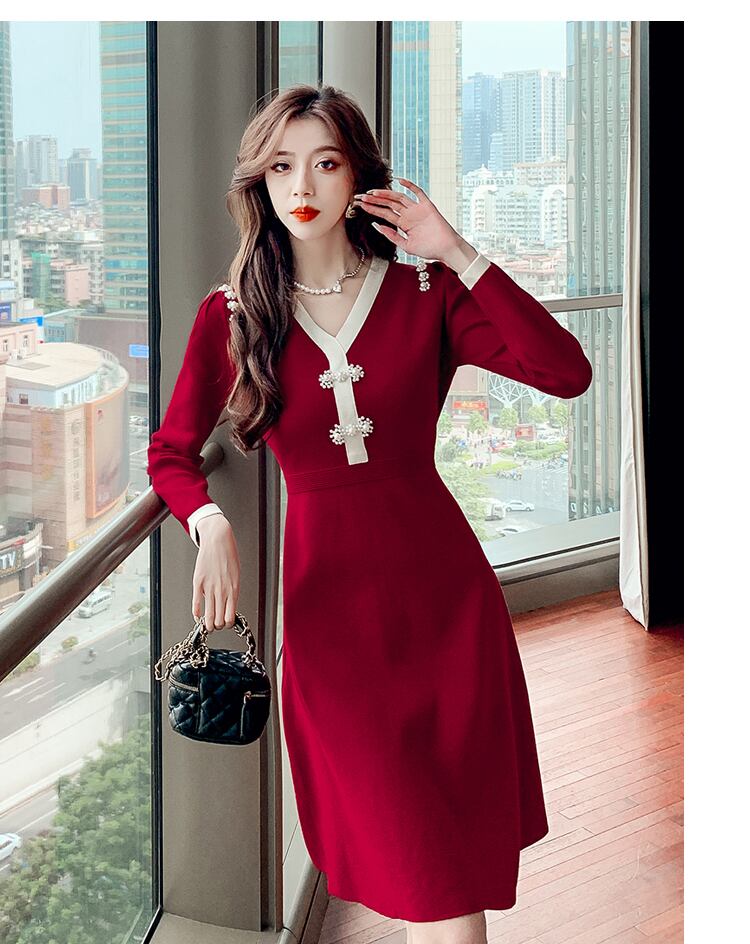 レッドビーズスリムニットセータードレス春と秋 V ネック長袖 A ラインミニニットドレス ロング スプリング 春物 オータム 秋物 Vネック Aライン