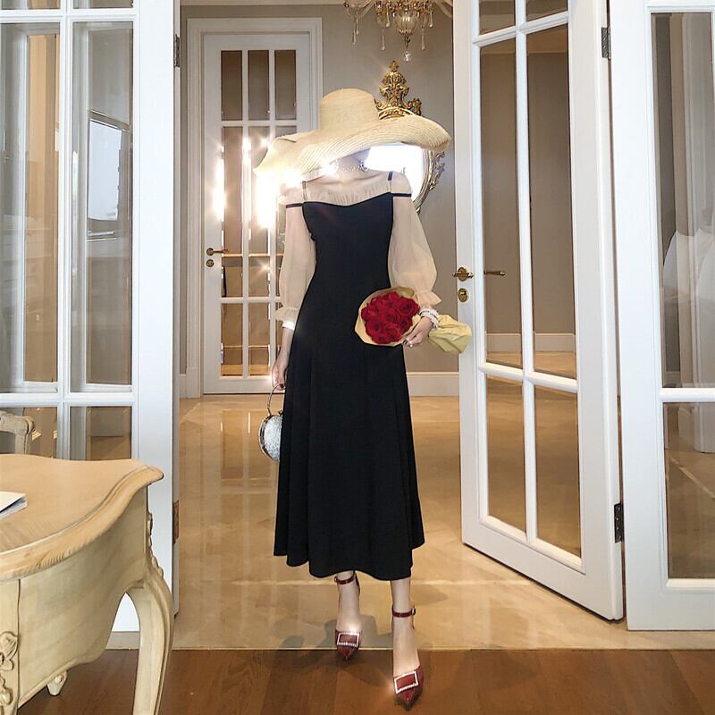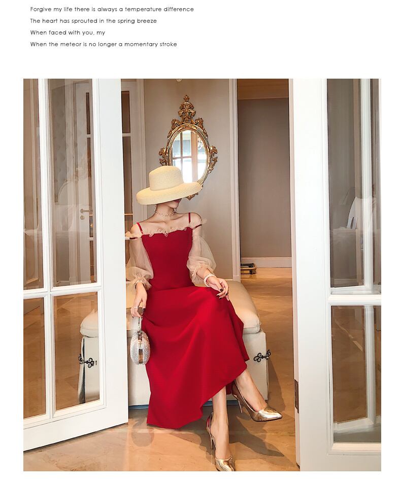 ワンショルダーメッシュステッチパーティードレスブラック/ワインレッド七分袖スリムAラインイブニングドレス