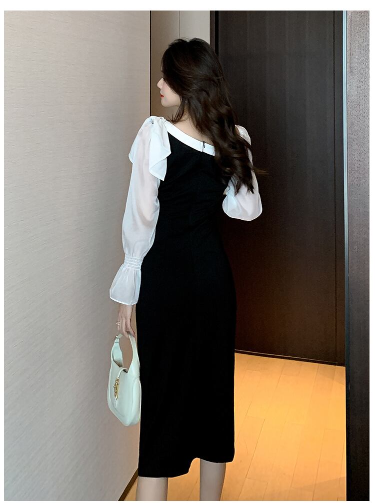 黒と白ステッチワンショルダーパーティードレス春と秋オフィススリムドレス ホワイト ブラック スプリング 春物 オータム 秋物 会社 学校 通勤や通学にも